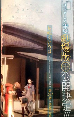 Vous connaissez surement le manga et anime tranche de vie Hanasaku iroha, en effet si vous nous suivez vous vous souviendrez que cet anime fait partie de la fournée Automne 2011. Et bien pour les personnes qui ont aimé l'histoire touchante de Ohana, l'héroïne et ses amies reviendront au cinéma cette année.Il a en effet été annoncé via le quatrième tome du manga Hanasaku Iroha qu'un film intitulé Hanasaku Iroha Home Sweet Home est en prévision pour 9 Mars 2013.